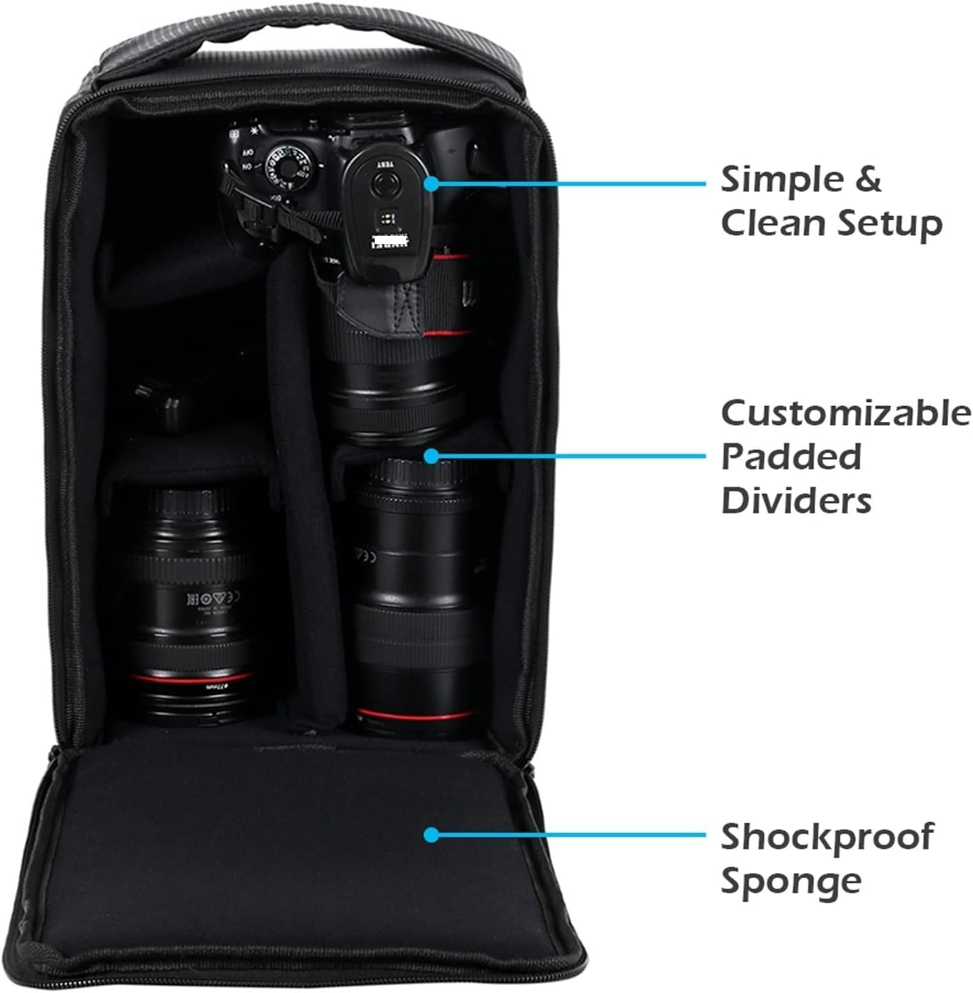 El forro interior de esta bolsa para cámara está relleno de algodón perlado EPE a prueba de golpes respetuoso con el medio ambiente, que es más grueso y ultraligero, y la partición del forro se puede mover de manera flexible.